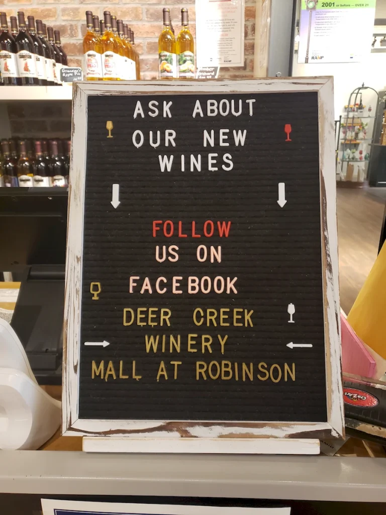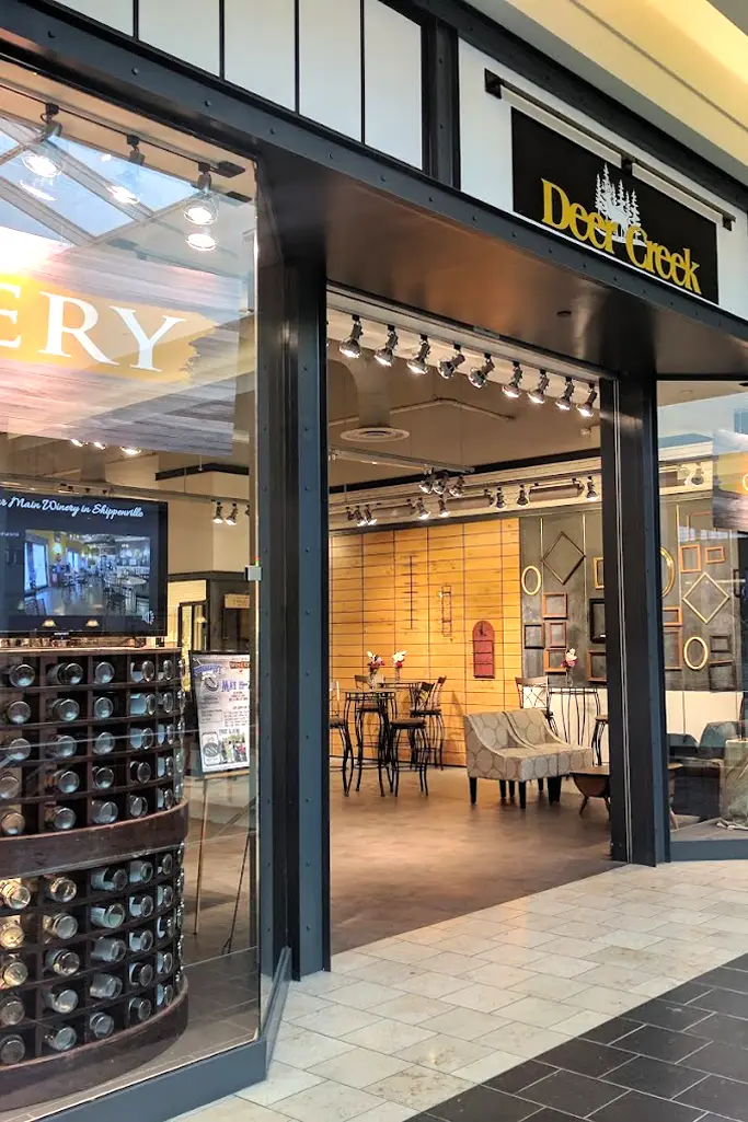 Located just a few miles from the Pittsburgh International Airport and Moon Township, our Deer Creek Winery Mall at Robinson store was the first to bring our award-winning wines to the Pittsburgh area. Visitors can shop their favorite Deer Creek wines, discover unique gourmet gifts, and explore our premium olive oils and vinegars. Whether you’re stopping by to stock up on bottles or simply want to relax, enjoy a freshly poured glass of wine in our comfortable seating area—perfect for a break while shopping at The Mall at Robinson.