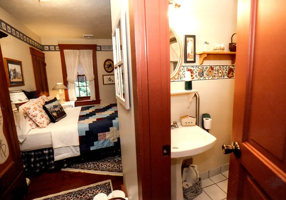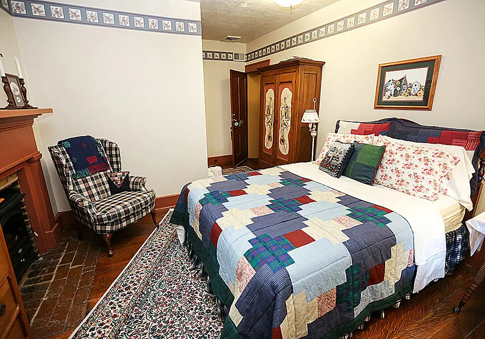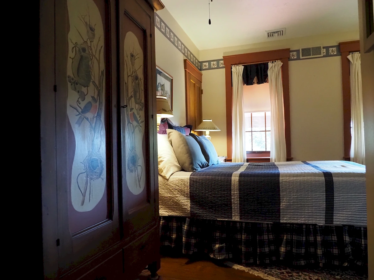 The room’s signature detail—a crimson frieze of graceful bluebirds—adds a whimsical and heartwarming touch to its timeless design. Settle into the queen-sized bed with plush bedding, unwind in one of the two classic wingback chairs, or enjoy the soothing atmosphere created by the fireplace. The private en-suite bath and shower ensure your stay is comfortable, peaceful, and memorable.