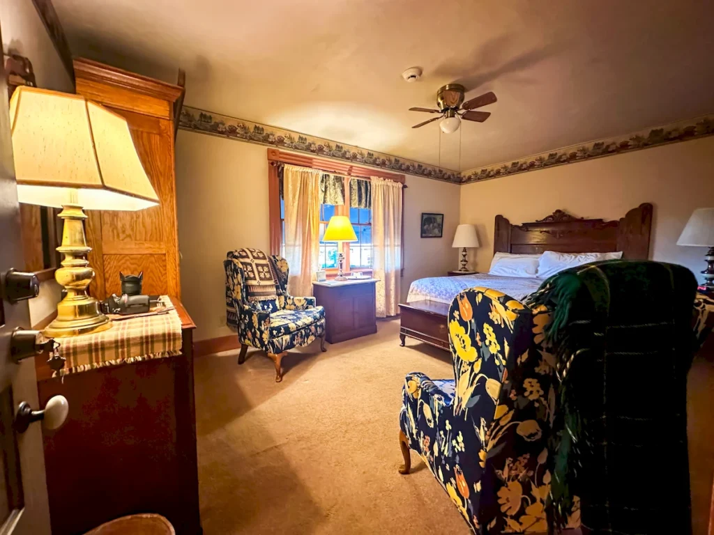 Inside, comfort meets elegance. A king-sized bed with a hand-carved oak headboard anchors the room, complemented by a stately oak armoire and two cozy wingback chairs—ideal for reading, unwinding, or enjoying a glass of Deer Creek wine. Warm lighting and timeless décor create a relaxing atmosphere perfect for couples or solo travelers.