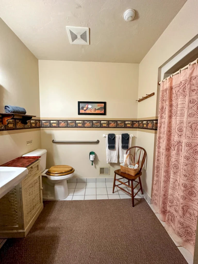 Designed with accessibility in mind, The John Watson Room features ADA-friendly accommodations including a high-rise toilet with grab bars, a roll-in shower with seating and detachable shower head, and ramp access to the main entrance.