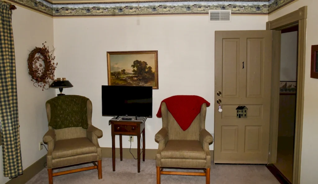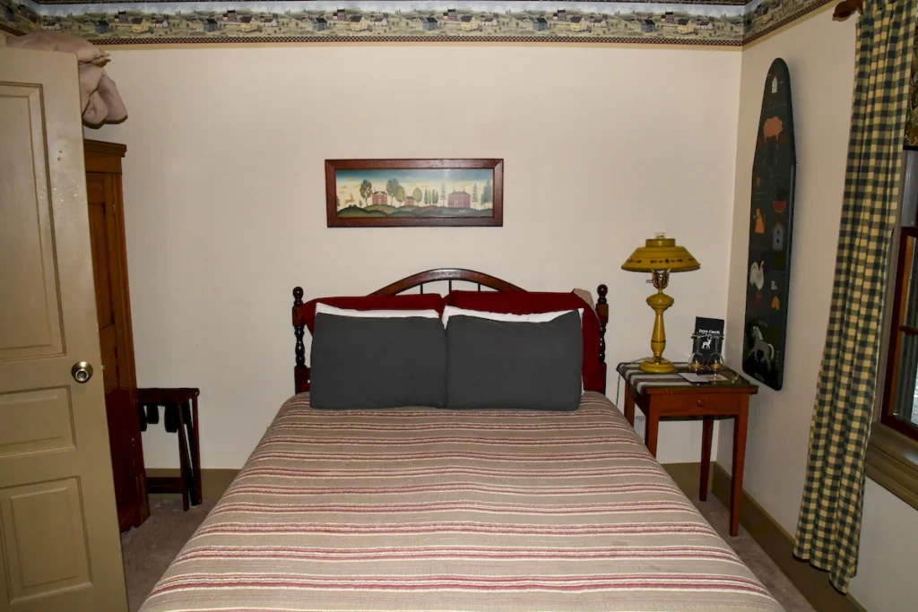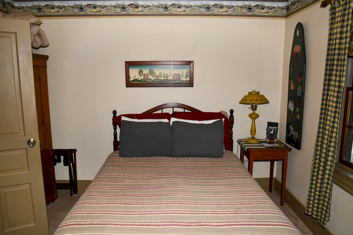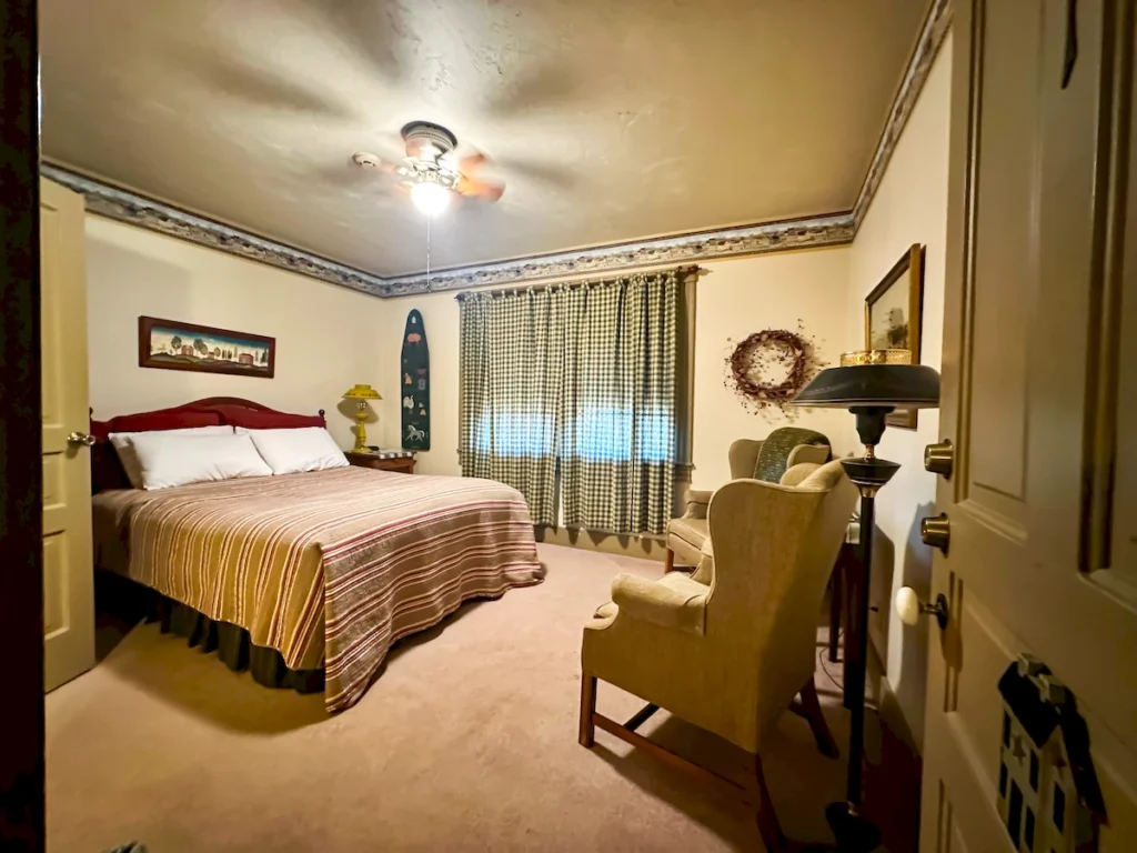 - Historic charm – Oak queen bed, carved armoire, vintage décor, and pastoral views