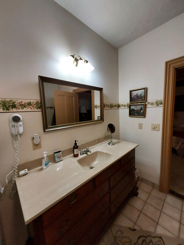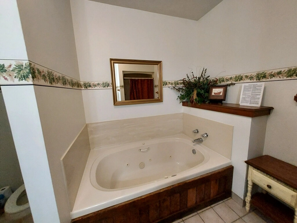 The private en-suite bath continues the garden-inspired theme with an antique oak vanity and a spacious two-person whirlpool/shower combo—ideal for unwinding after a day of exploring the winery grounds. Whether you’re here for romance, relaxation, or a weekend of wine and music, The Laurel Suite offers a bright, welcoming retreat.