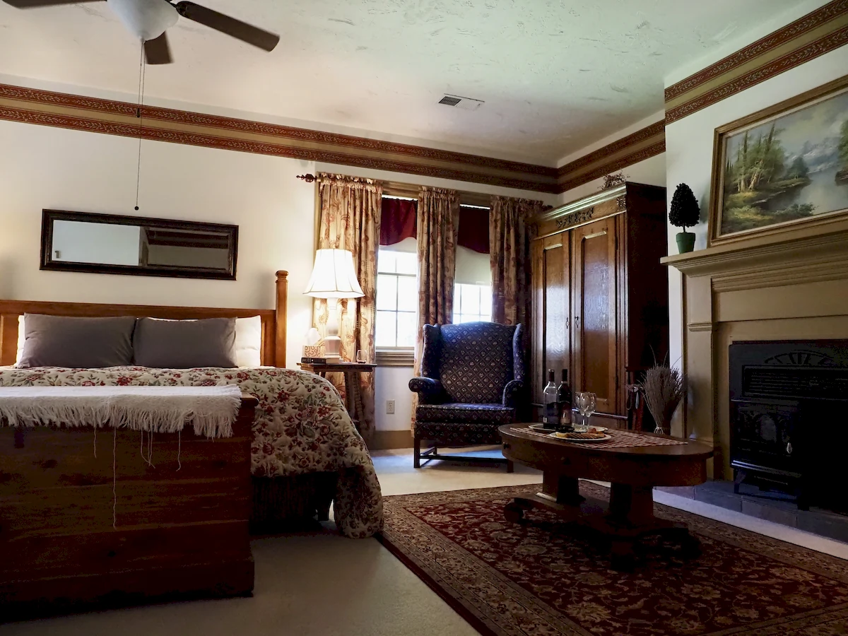 Inside, a stately king-sized bed and antique oak furnishings set the stage for relaxation. Two wingback chairs by the window provide a perfect perch for reading, sipping wine, or simply enjoying the courtyard views. An electric radiant fireplace adds a cozy glow, while thoughtful touches like a mini fridge and luggage racks keep your stay stress-free.