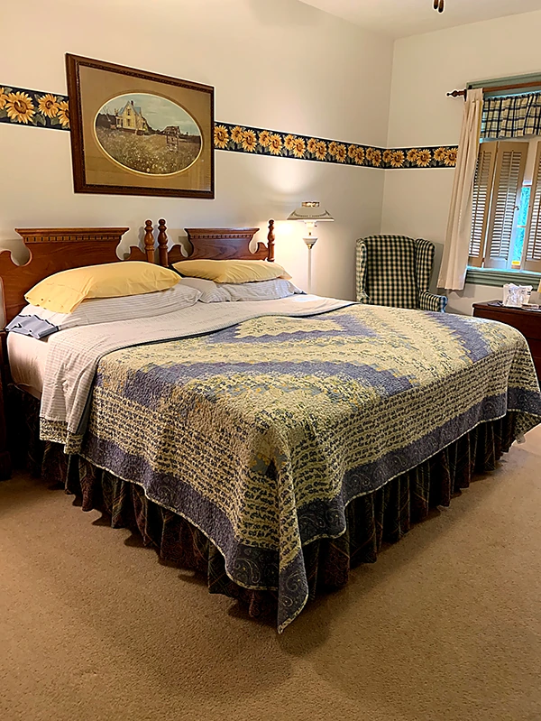 Step into the warmth and charm of The Laurel Suite at Deer Creek Winery’s Harvest House, where cheerful sunflower accents in yellow, navy, and green bring the beauty of a summer garden indoors. This bright, inviting guestroom overlooks the cobblestone courtyard and raised flower beds, offering both comfort and charm for your Pennsylvania wine country escape.
