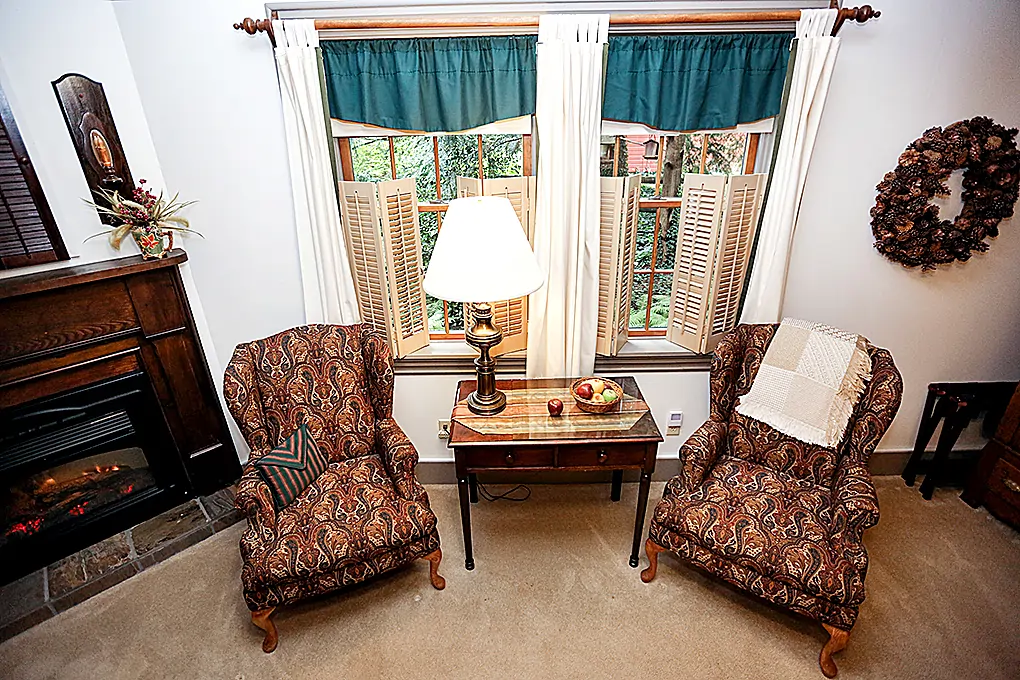 - Inviting seating – Two paisley wingback chairs with views of the surrounding woodlands