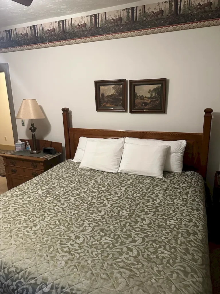 The private en-suite bath features a whirlpool soaking tub and shower combo, oak vanity, and thoughtful details designed for comfort and relaxation. Whether you’re here for a romantic getaway, a weekend escape, or a peaceful retreat in nature, The Woodlands Room offers the perfect balance of rustic charm and modern amenities.
