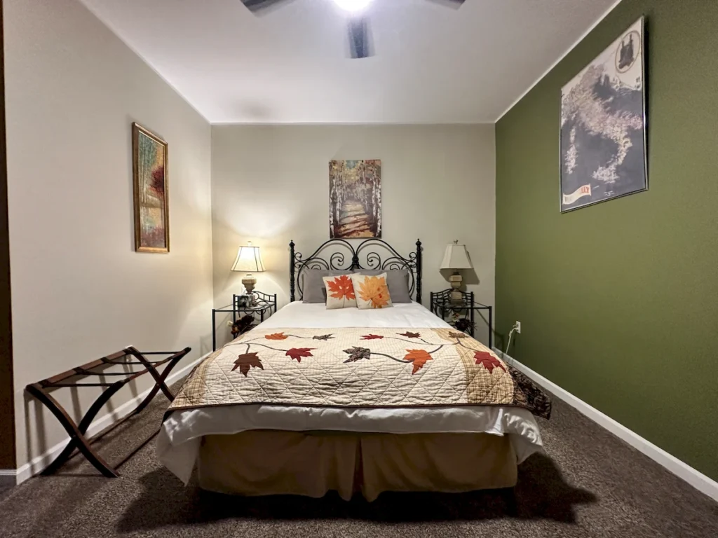 Settle into the queen-sized bed, enjoy the glow of the fireplace, or share a bottle of wine at the intimate dining table. Whether you’re savoring a quiet evening together or waking up to forest views and a complimentary breakfast, the Autumn in Italy Room blends comfort and charm seamlessly.