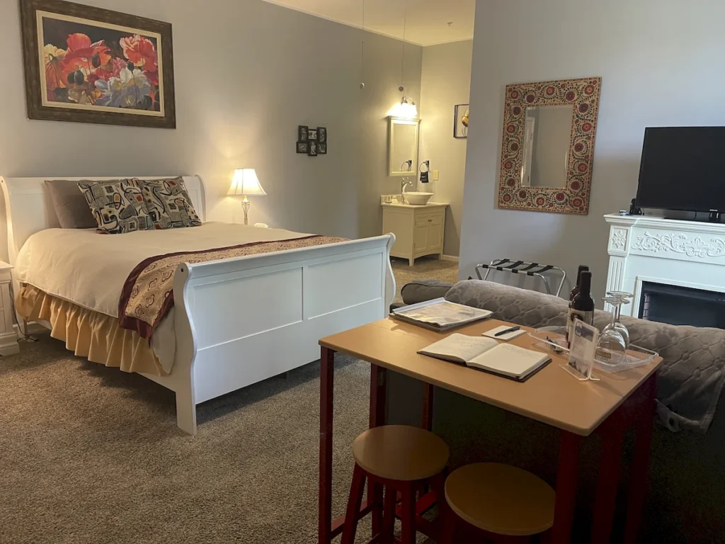 Whether you’re soaking in your Jacuzzi, sharing a romantic fireside dinner, or exploring the scenic grounds of Deer Creek Winery’s Inn B&B, the Spring in Spain Room offers the perfect blend of exotic flair and local wine-country charm.