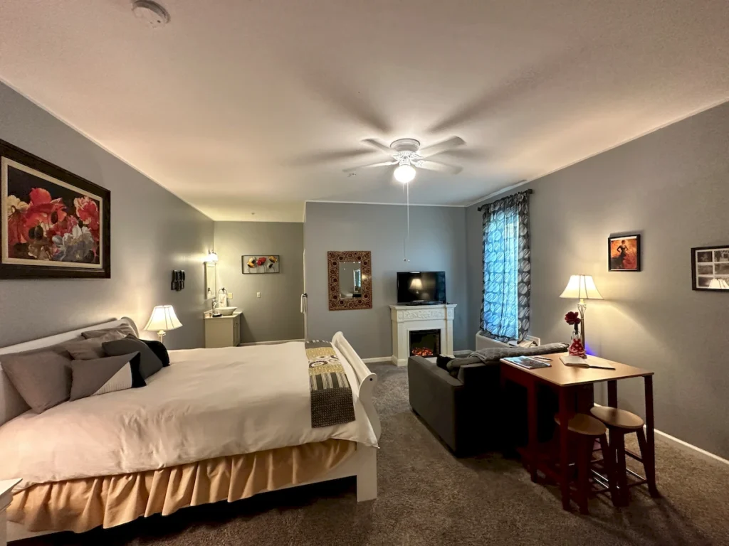 Perfect for a romantic getaway near Pittsburgh, Erie, or Clarion, PA, the Spring in Spain Room features a queen-sized bed, a private in-room Jacuzzi tub, and a fireside sitting and dining area where you can relax with a glass of wine. Whether you’re celebrating a special occasion or simply seeking a quiet weekend escape, this suite offers both comfort and style.