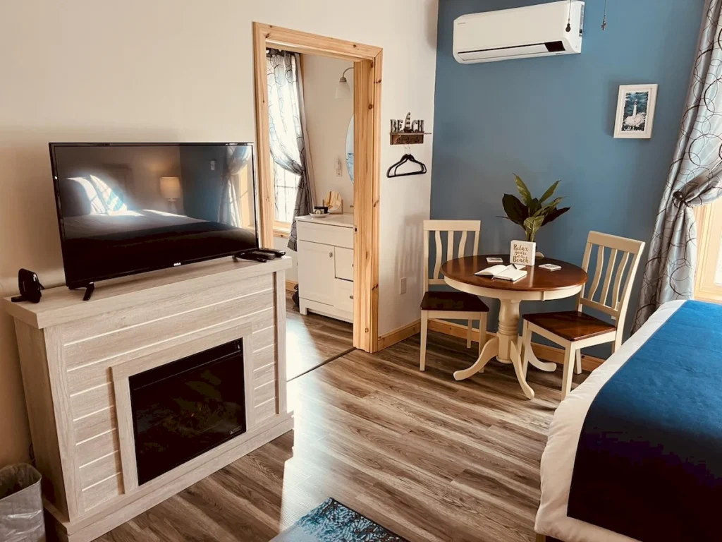 Bright, cheerful, and inspired by the coast, the Alabama Beaches Room at The Manor brings the warmth and sunshine of Gulf Shores and Mobile Bay right to the heart of Western Pennsylvania wine country. Once the kitchen of the Manor, this space has been beautifully transformed into a cozy retreat that feels fresh, inviting, and full of coastal charm. Perfect for a romantic getaway near Pittsburgh, Erie, or Clarion, PA, the Alabama Beaches Room features a queen-sized bed, charming décor, and a cozy fireplace that makes every stay feel special. Step outside to relax in the two-person outdoor hot tub on the Manor’s porch, or sip a glass of wine under the stars by the firepits.