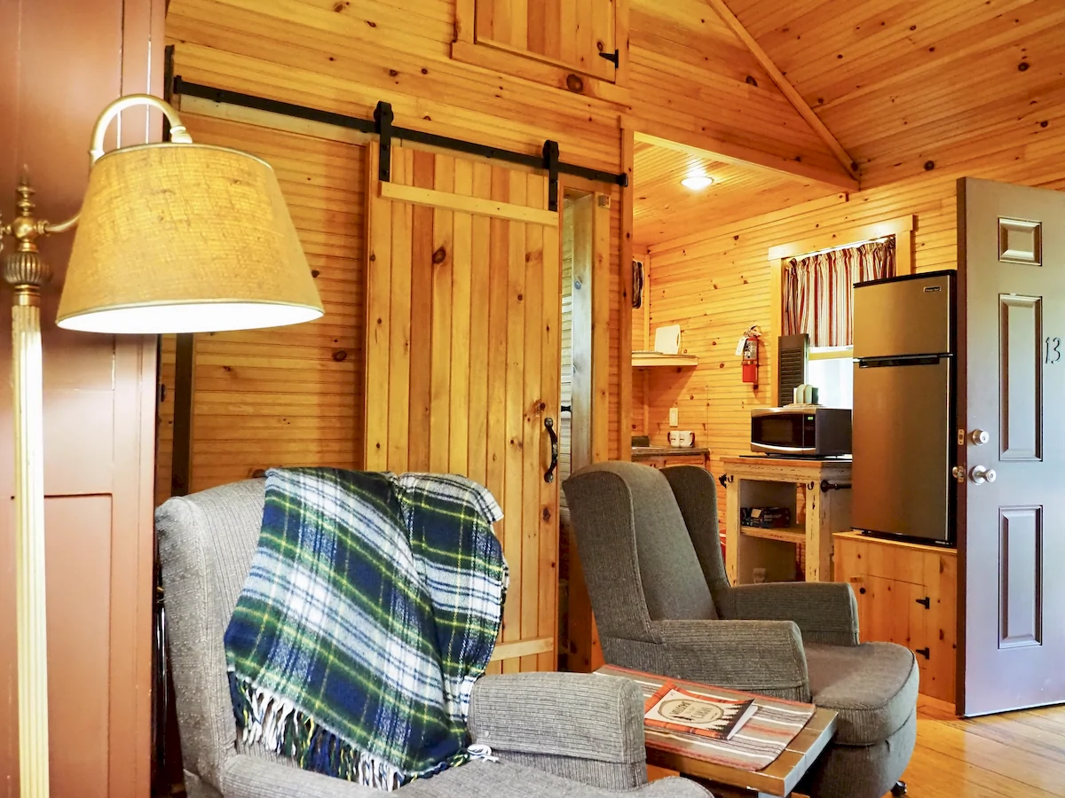 - Relaxation & leisure – Private covered porch with rocking chairs, outdoor firepit, access to a two-person hot tub on the Harvest House patio, and a covered picnic table with a park stand grill